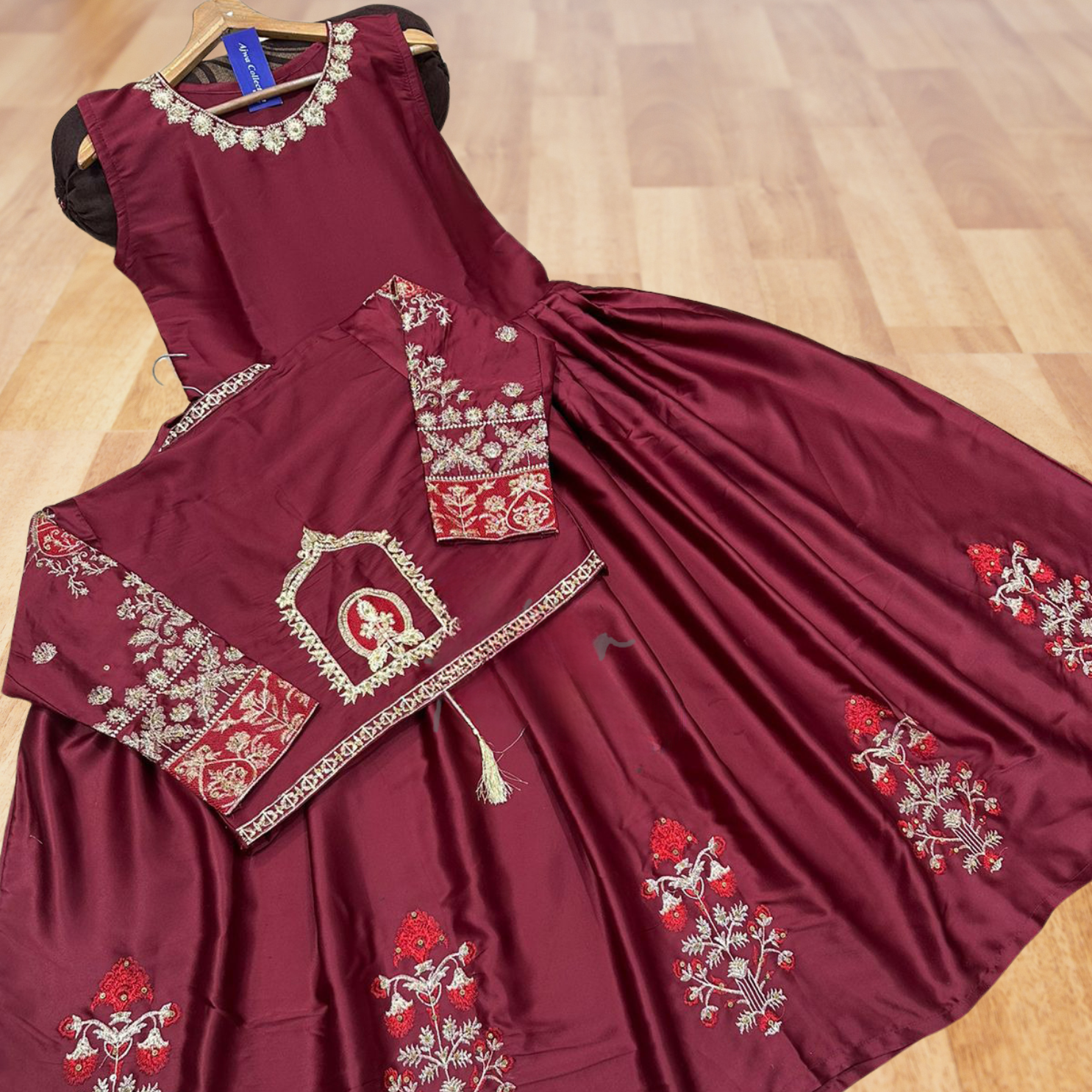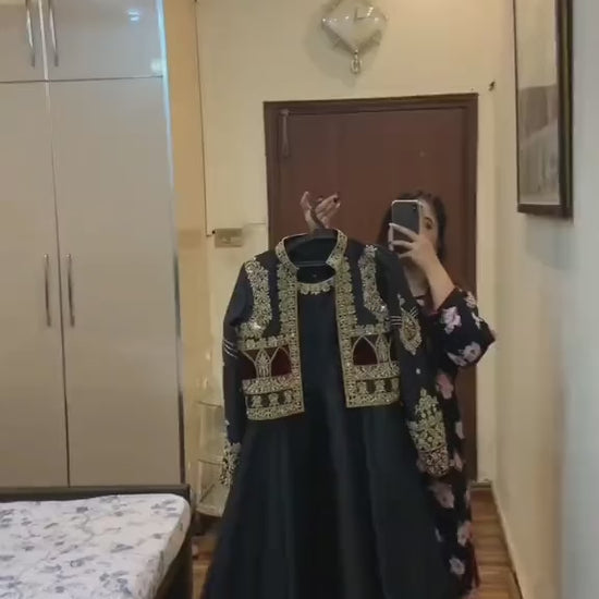 Experience timeless elegance with the Ajwa Collection 2-Piece Maxi Set by A&T, featuring intricate all-over handwork and heavy nug stone embroidery. The finely crafted koti showcases detailed embroidery on both front and back, paired with a flowing embroidered long maxi for a graceful and luxurious silhouette. Made from premium shamose silk, this outfit is ideal for festive wear, weddings, and formal occasions.